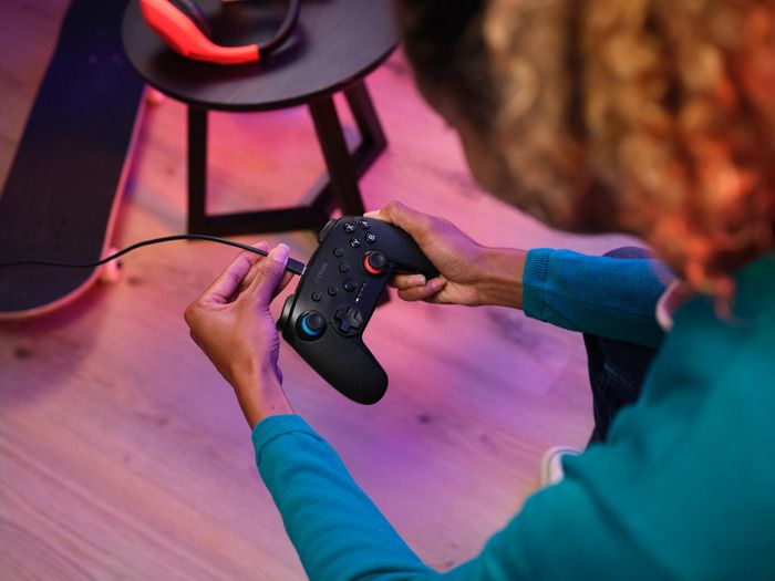 Manette sans fil TRUST GXT 1246 Muta pour Nintendo Switch, Lite et OLED. Profitez de 15h de jeu avec commandes de mouvement et retour de vibration. Connectivité Bluetooth pour un confort optimal en mode TV ou table.