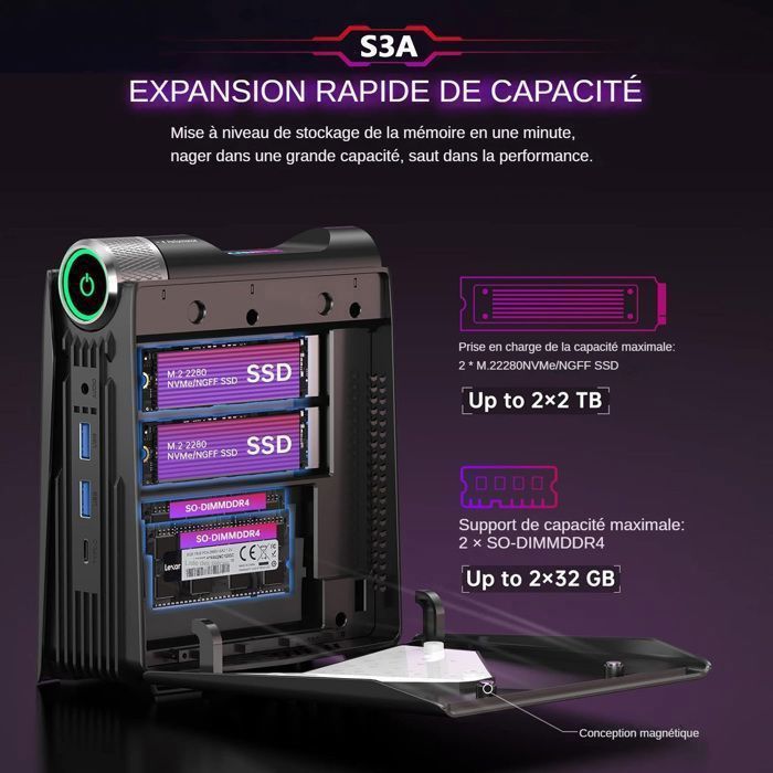 S3A Mini PC 32Go DDR5 4800MHz 512Go NVME PCIe3.0 SSD, AMD Ryzen 7 5700HX (8C/16T, jusqu’à 4,4 GHz),AMD Radeon Graphics Gaming Micro Ordinateur de Bureau avec réglage 3 Modes | WIFI6 | LAN 2.5G|RGB