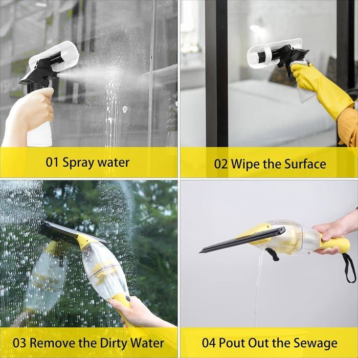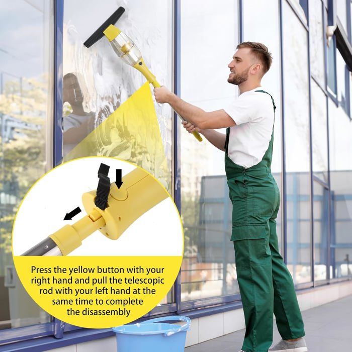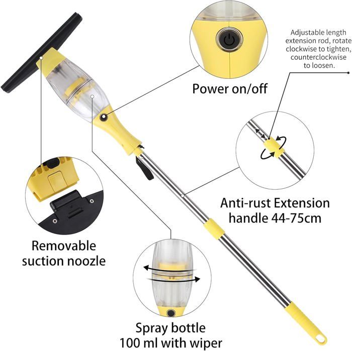 Facile à démonter Équipé d’une tête de nettoyage de vitres amovible et d’une tige télescopique pour un nettoyage rapide. N’allumez pas l’appareil avant de vous être assuré que la buse est correctement insérée. Le grattoir avec les engrenages pointe vers le bas. Le réservoir d’eau amovible de 100 ml peut contenir plus d’eau sale et est facile à retirer et à nettoyer.