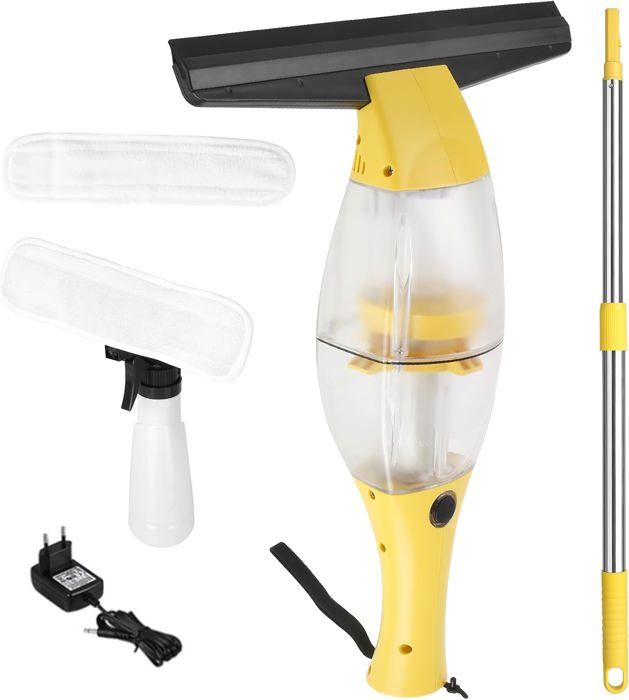 Nettoyeur de vitres électrique sans fil avec manche télescopique. autonomie de la batterie : 28 min. buse d’aspiration de 28 cm. vaporisateur avec housse en microfibre pour un nettoyage sans traces à