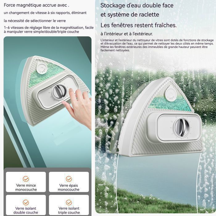 Ce nettoyeur de vitres magnétique dispose de 6 niveaux de force réglable, vous pouvez l’ajuster en fonction des différentes épaisseurs du verre.