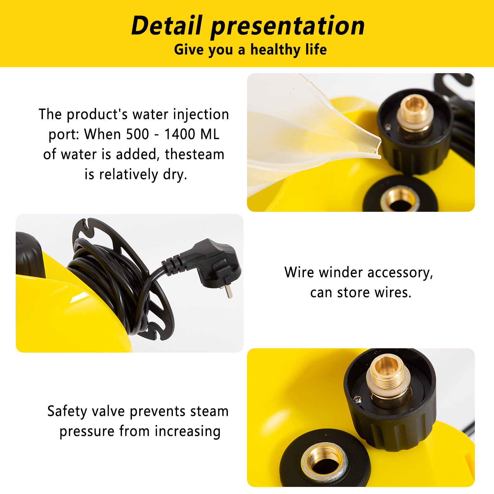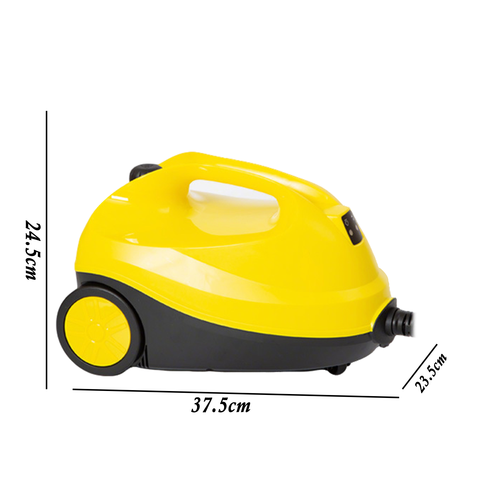 Capacité : 1,8 LPuissance : 2 000 WTension nominale : 220 V-50 HzLongueur du cordon d’alimentation : 3 mLongueur du tuyau de sortie : 1,5 mLongueur de la rallonge : 48 cm x 2Temps de préchauffage : 5 à 8 minutesDurée d’utilisation : environ 50 minutesPression maximale : 4 bars/4 kgMatériau du réservoir : alliage d’aluminiumDimensions : 24,5 x 37,5 x 23,5 cmDimensions de l’emballage : 52 x 31 x 28,5 cmPoids brut : 5,5 kgEmballage : boîte en cartonCaractéristiquesNettoyage optimal : Ce nettoyeur vapeur nettoie en profondeur diverses surfaces domestiques et sols durs, avec une pression de vapeur allant jusqu’à 4 bars et une puissance de chauffe de 2 000 W.Nettoyage hygiénique : Ce nettoyeur vapeur élimine jusqu’à 99,999 % des virus* et des bactéries** présents sur les surfaces dures. Un seul réservoir de solution nettoyante suffit pour nettoyer une surface allant jusqu’à 75 m², sans avoir à le remplir. Kit de nettoyage des sols : Équipé d’une buse de sol, d’une serpillière en microfibre à technologie de flocons hautement nettoyants et de deux tubes rallonges, il est également idéal pour nettoyer les sols.Appareil d’entrée de gamme polyvalent : Grâce à sa large gamme d’accessoires, vous pouvez nettoyer différentes surfaces individuellement ou de grandes surfaces simultanément, que ce soit dans la salle de bain, la cuisine ou le salon.
