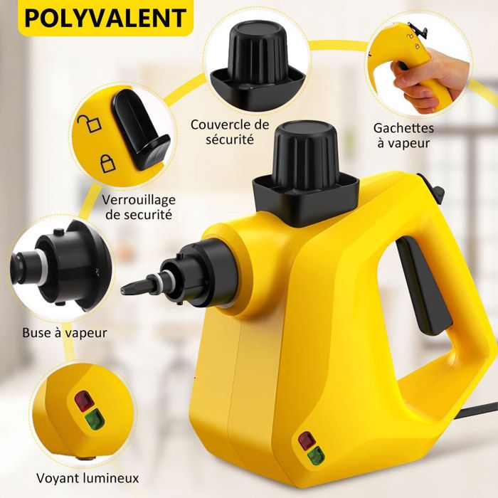 - Le nettoyeur à vapeur portatif est équipé d’une puissance élevée de 1000 W et d’un verrouillage de sécurité, qui peut générer une sortie de vapeur à haute température de 105 °C et à haute pression de 3 bars en trois minutes.