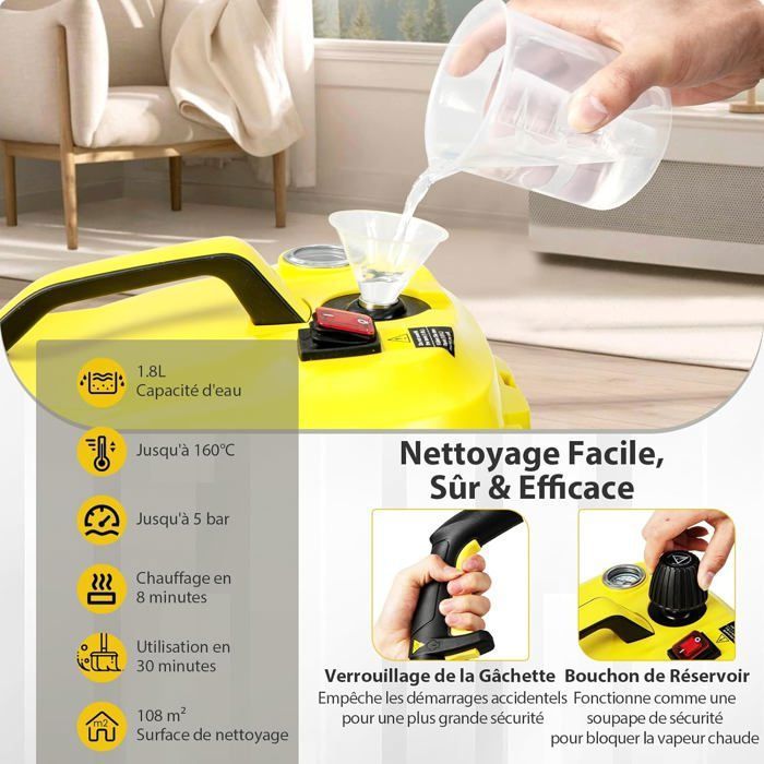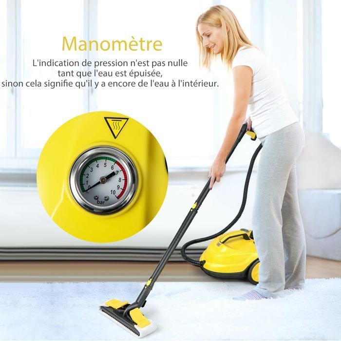 | Nom du produit | Nettoyeur Vapeur Polyvalent 2000W COSTWAY pour Punaises de Lit-5 BAR-15 Accessoires et Manomètres-Réservoir 1,8L-160°C-4 Roue-Jaune |