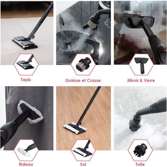 ——Le balai vapeur nettoyeur à vapeur 2000W est un outil précieux pour lutter contre les punaises de lit. Efficace, rapide et écologique, il peut éliminer les interstices et les recoins difficiles d’accès pour les agents chimiques——Un grand réservoir de 1,5 L fournit de la vapeur continue pendant 30 à 45 minutes.——Pression : 4,0 Bar——Température de vapeur maximale : 108℃——Temps de chauffage : 5-6 min (environ)——Le mode vapeur réglable peut répondre à vos besoins spécifiques dans différents scénarios.——Un verrou enfant est prévu pour protéger les enfants et les animaux domestiques.——19 accessoires polyvalents pour différentes surfaces de nettoyage.——S’éteint automatiquement après le séchage de l’eau.——Mise hors tension automatique en cas de surchauffe——Chaudière en aluminium durable et super épaisse pour une longue durée de vie.——Un cordon d’alimentation de 3 m et 2 autres tubes de vapeur d’extension offrent une plus grande plage de nettoyage.——2 voyants LED vous rappellent le manque d’eau ou l’état de vapeur haute pression.——2 contrôles de température pour éviter que la machine ne s’éteigne.——L’enrouleur de cordon et le petit dispositif de stockage d’accessoires gardent tout en ordre——Dimensions Nettoyeur : 23 cm x 43 cm x 114,5 cm