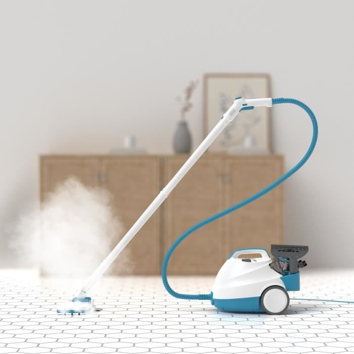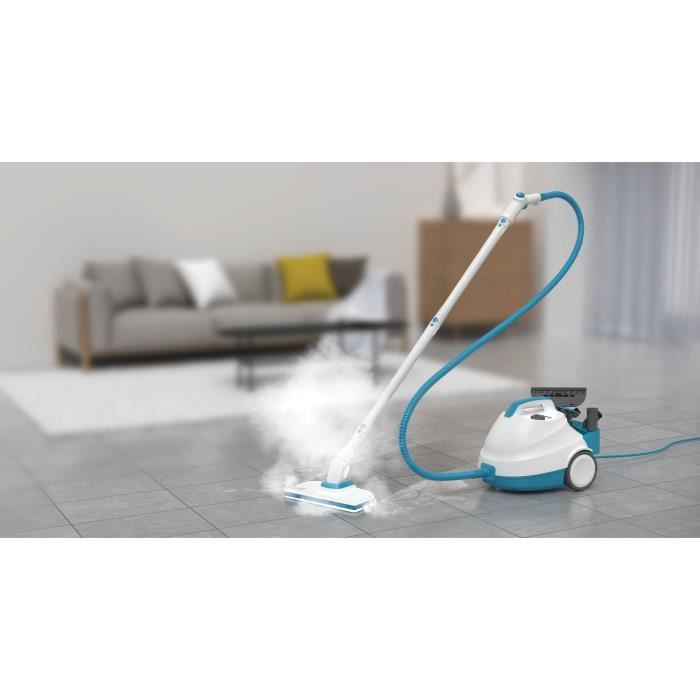 Nettoyeur vapeur traineau multifonction avec temps de chauffe de 4 minutes et réservoir amovible de 1,2L. Câble de 6 m et vapeur haute pression pour un nettoyage en profondeur. Pression vapeur de 4 bars et débit réglable. Nettoie toutes les surfaces de la maison et élimine 99.9% des germes sans produits chimiques.