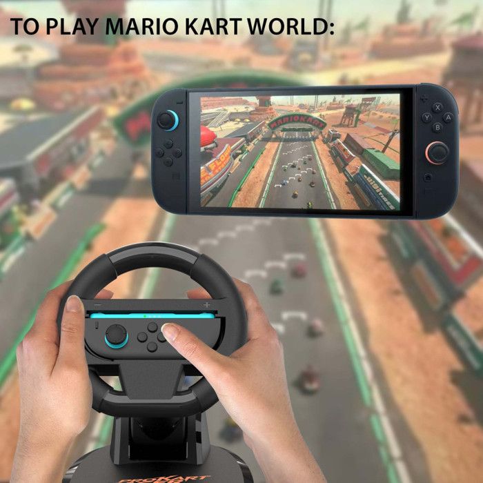 Un volant conçu pour les consoles Nintendo Switch Prenez le contrôle comme jamais auparavant avec le volant Switch 2, spécialement conçu pour la Nintendo Switch et la Switch 2. Conçu pour offrir une immersion totale, le Pro Kart Racer propose : Rotation fluide à 180° : 90° à gauche, 90° à droite, pour des virages précis et dynamiques. Volant démontable et stand pliable : facile à ranger, facile à emporter. Gâchettes arrière ergonomiques : pour un meilleur contrôle dans les moments les plus intenses de la course. Fixation stable : 4 ventouses haute résistance pour une adhérence parfaite sur toutes les surfaces planes. Confort et ergonomie : meilleure prise en main qu’un Joy-Con seul. L’accessoire indispensable pour jouer à Mario Kart World Profitez pleinement dans la course comme si vous y étiez sur Mario Kart World, Mario Kart 8 Deluxe et tous les jeux de course compatibles avec le gyroscope. Jouez en duo avec seulement une paire de Joy-Con ! Installez-le en quelques secondes : fixez la base, dépliez la colonne, clipsez votre Joy-Con et c’est parti ! Compatible Switch & Switch 2 : fonctionne avec les Joy-Con classiques et les Joy-Con 2 (non inclus). Adapté aux enfants comme aux adultes : design sport et prise en main universelle. Développé pour une expérience de conduite réaliste et intuitive sur tous vos jeux de kart préférés.