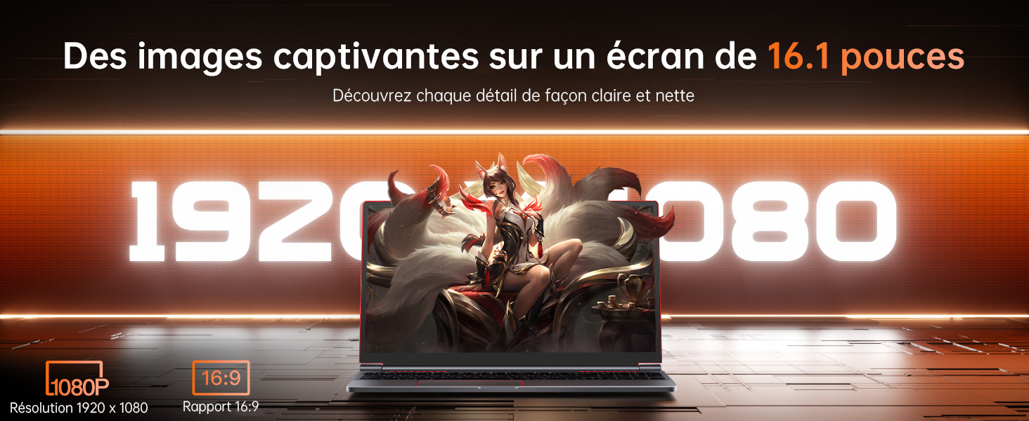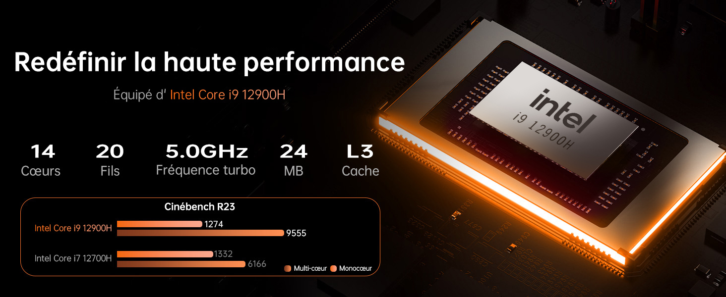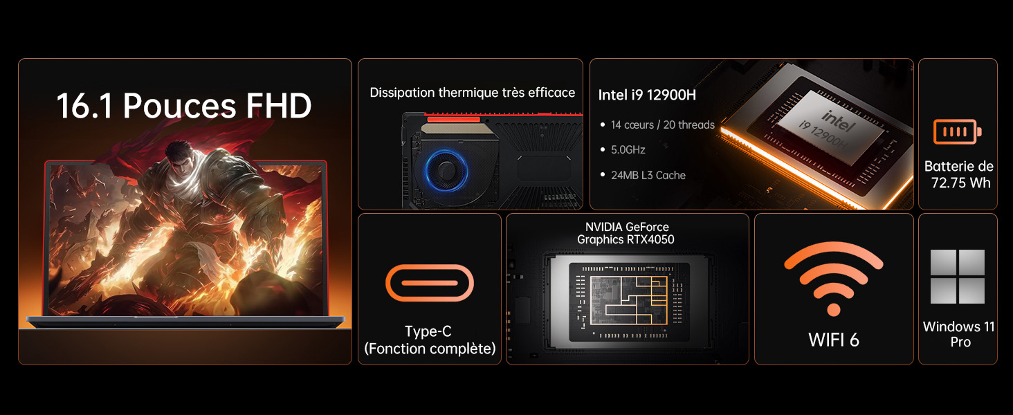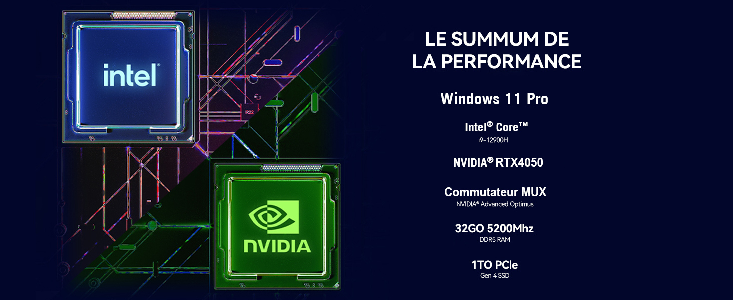 | Nom du produit | PC Portable Gamer-Intel Core i9-12900H(14C/20T,jusqu’à 5,0 GHz) -NVIDIA GeForce RTX 4050-DDR5 32Go RAM-1To SSD-Windows 11 Pro-16.1″ |