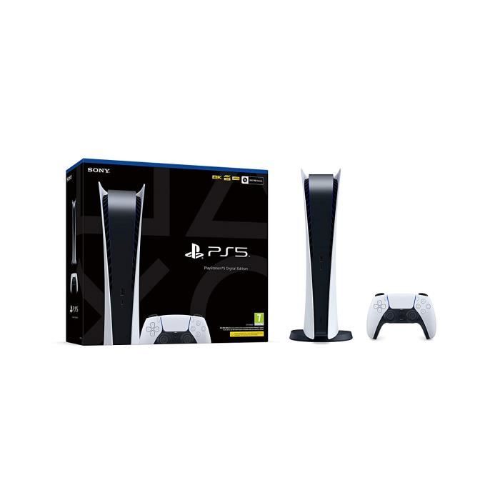 PlayStation 5 Édition numérique sans lecteur de disque. Une console révolutionnaire entièrement centrée sur le joueur pour des expériences encore plus immersives et connectées avec vos jeux PS5 et PS4 rétrocompatiblesTemps de chargement quasi instantanés pour les jeux PS5 (installés) grâce à un disque SSD ultra-haute vitesse, Interface utilisateur conçue pour fournir un accès immédiat à presque toutes les options du système sans quitter votre partieNiveau de réalisme inégalé grâce à la technologie de rendu de la lumière Ray Tracing, Prise en charge de la technologie HDR pour des couleurs vives et dynamiques, Possibilité de jouer en 4K et 8K sur les jeux et écrans compatiblesTechnologie Tempest 3D AudioTech pour une immersion sonore hors du commun, Retour haptique et gâchettes adaptatives via la manette DualSense pour ressentir les effets et l’impact de vos actions en jeu (sur une sélection de jeux PS5)Contenu : 1x Sony PlayStation 5 Édition numérique, 1x Manette DualSense, 1x socle, Connectique : 1 port HDMI 2.1, 3 ports USB, 1 port USB-C, 1 port Ethernet, Dimensions de la console (lxHxL) : 390 mm x 92 mm x 260 mm, Poids : 3,9 kg, Couleur : Blanche