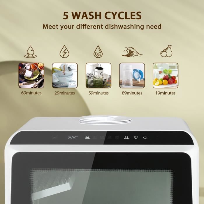 • Petite taille, grande capacité :Ce lave-vaisselle portatif ne nécessite aucune installation et sa petite taille le rend facile à transporter et à déplacer.