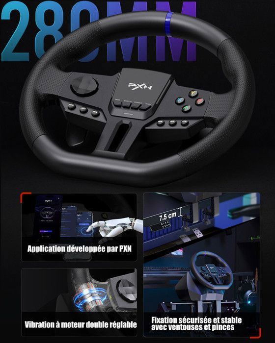 Le volant de jeu PXN V900 GEN2 est compatible avec les PC (Windows 7/8/10/11), PS3, PS4, Xbox One, Xbox Series X|S, et Nintendo Switch. Compatibilité multiplateforme 6 en 1 pour jouer à plus de jeux de course et de simulations de camions. Caractéristiques : Deux modes de pilotage 270/900°, palettes de course, retour de vibrations, double pédale linéaire (accélérateur, frein).