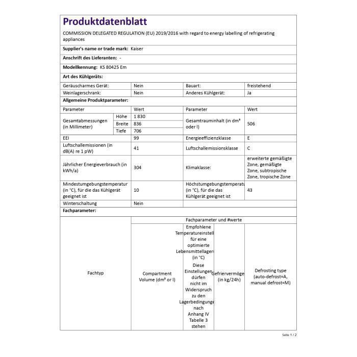 Réfrigérateur-congélateur combiné Side-by-Side KS 80425 Em, Kaiser – fabricant berlinois d’appareils électroménagers haut de gamme, Fabrication conforme aux normes de qualité, de design et de protection de l’environnement les plus strictes, Lauréat du German Brand Award 2017 et 2018, Lauréat du German Design Award 2020, Veuillez tenir compte du délai de livraison, Dimensions : H 1830 / L 836 / P 706 mm, Classe énergétique : E (anciennement A+), 1 compresseur, Capacité brute : 506 L, Réfrigérateur : 323 L, Congélateur : 183 L, Température de conservation : –23 °C, Pouvoir de congélation : 10 kg / 24 h, Régulation de température indépendante : oui, Alarme sonore et visuelle : oui, Dégivrage automatique, Fonction Superfrost : oui, Éclairage intérieur LED, Pieds réglables, Tablettes en verre de sécurité : 2, Bacs à légumes/fruits : 2, Bacs MULTIBOX amovibles : 2, Balconnets de porte : 5, Bac à œufs : 1, Tiroirs congélateur : 2, Clayettes : 5, Super Ice Box : 1, Finition : inox anti-traces, Consommation : 0,83 kWh/jour ou 304 kWh/an, Gaz réfrigérant : R600A, Classe climatique : SN/N/ST/T, Poids net : 94 kg, Poids brut : 103 kg,