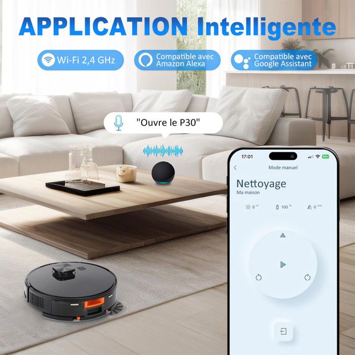 | Navigation sur la salle | Oui, une carte précise de votre intérieur en seulement 25 minutes et détermine le meilleur itinéraire pour un nettoyage optimal. Grâce à sa fonction d’évitement des obstacles, il navigue sans difficulté autour des objets, évitant les coincements et assurant un nettoyage efficace de votre maison |