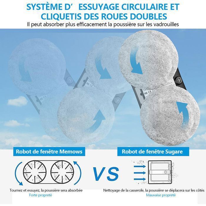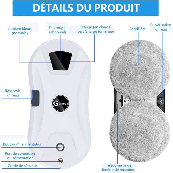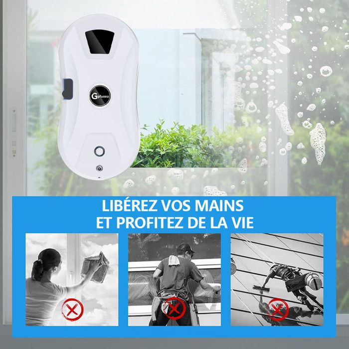 | Autres caractéristiques | Le robot lave-vitres contient 10 pièces (5 paires) de chiffons de nettoyage en fibres haute densité qui sont lavables, réutilisables et ne rayeront pas le verre. |
