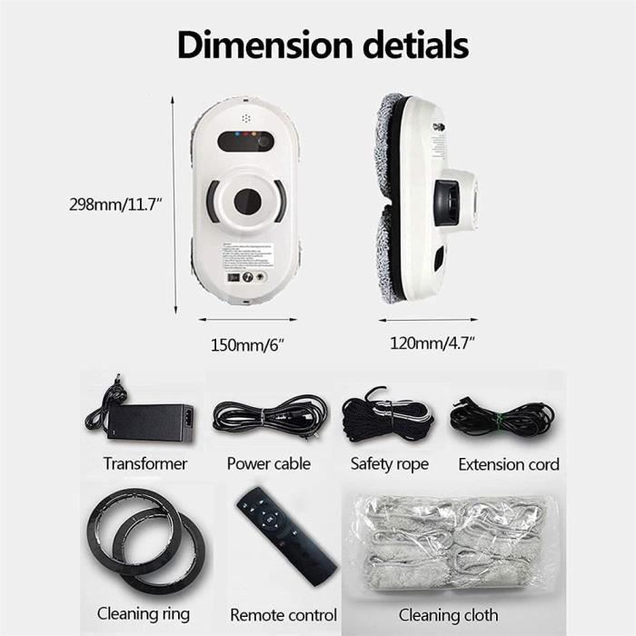 1 pcs * Robot de nettoyage de vitres, 1 pcs * transformateur, 1 pcs * Cordon d’alimentation, 1 pcs * Corde de sécurité, 1 pcs * Rallonge, 2 pcs * Anneau de nettoyage, 1 pcs * Télécommande, 10 pcs * Ch iffons de nettoyage. |