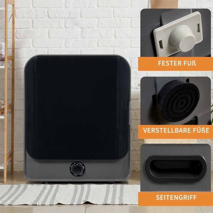 Capacité de séchage : Max. 4,5 kg; Nombre de programmes : 5; Température de séchage : 40 à 60 °C; Puissance de chauffage : 830 W; Matériel : Inox + ABS + PCM; Dimensions : 49,5 x 43,5 x 59,5 cm; Bruit : 62 dB; Plus produit : protection contre la surchauffe