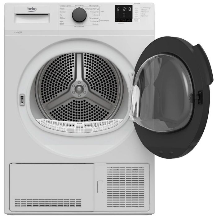 CARACTERISTIQUES TECHNIQUES : PERFORMANCESCapacité max. (kg)10.0Classe d’efficacité énergétique BNiveau sonore 65 dB(A)Efficacité de condensation BConso. d’énergie annuelle 670.9 kWhCARACTERISTIQUESType d’affichage Afficheur DigitalType de moteur StandardMatière du tambour InoxType de tambour A alvéoles AquawaveVolume du tambour (l) 110Tambour à rotation alternée OuiPosition du réservoir d’eau En hautParois latérales Anti-vibrationsSuivi de Programmes OuiAffichage du temps restant OuiSonnerie de fin de cycle OuiTouche d’annulation sonnerie OuiTuyau d’évacuation directe OuiPROGRAMMESNombre de programmes 15Programme 1 Coton Prêt à repasserProgramme 2 Coton EcoProgramme 3 Coton Prêt à porterProgramme 4 Coton Extra SecProgramme 5 Synthétique Prêt à repasserProgramme 6 Synthétique Prêt à porterProgramme 7 MinuterieProgramme 8 Rafraîchissement LaineProgramme 9 Délicat/ChemisesProgramme 10 JeansProgramme 11 Sport/ThermiqueProgramme 12 Mix (quotidien)Programme 13 Hygiene (BabyProtect+)Programme 14 DélicatProgramme 15 Express 14’Durée programme coton standard 170 minutesFONCTIONSOption 1 Réglage du niveau de séchageSécurité enfant OuiFin différée 0-24 heuresVoyant de réservoir plein OuiVoyant d’entretien du condenseur OuiVoyant d’entretien du filtre OuiAnti-froissage automatique OuiDESIGNDesign BX2Type de porte Transparente fumée non réversibleCouleur du produit BlancCouleur du hublot AnthraciteAngle d’ouverture de la porte (°) 155Nombre de pieds réglables 4Bandeau Texte FrançaisDETAILS TECHNIQUESTension (V) 230Fréquence (Hz) 50Puissance totale (W) 2500Type de prise EuropéenneDIMENSIONSHauteur sans emballage (cm) 84.6 cmLargeur sans emballage (cm) 59.7 cmProfondeur sans emballage (cm) 60.1 cmPoids sans emballage (kg) 35.000 kgHauteur avec emballage (cm) 88.5 cmLargeur avec emballage (cm) 65.0 cmProfondeur avec emballage (cm) 63.0 cmPoids avec emballage (kg) 36.000 kgRESPECT DE L’ENVIRONNEMENTDisponibilité des pièces détachées 12 ansNotice en papier recyclé OuiProduit composé de plastique recyclé Oui