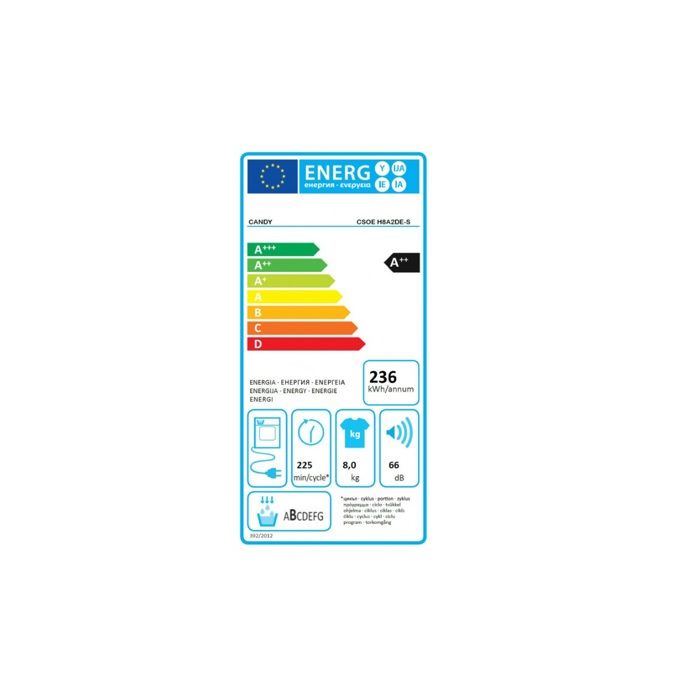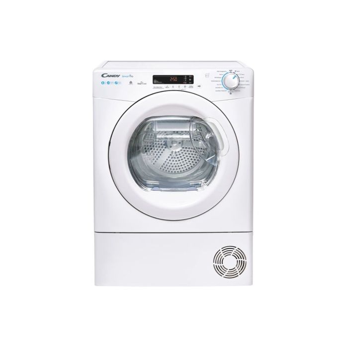 SECHE LINGE CANDY CONDENSATION POMPE A CHALEUR – CHARGEMENT FRONTAL HUBLOT – 8KG – DEPART DIFFERE 24H – NIVEAU SONORE 67DB – VOLUME TAMBOUR 115L ACIER GALVANISE – ROTATION ALTERNEE – BAC DE RECUPERATION D’EAU EASY CASE DANS LA PORTE – 15 PROGRAMMES – CLASSE ENERGIE A++ – CLASSE EFFICACITE CONDENSATION B – CONSOMMATION ANNUELLE 236KWH – POIDS 42.5KG – DIMENSION : 850*610*595mm (H*L*p) –