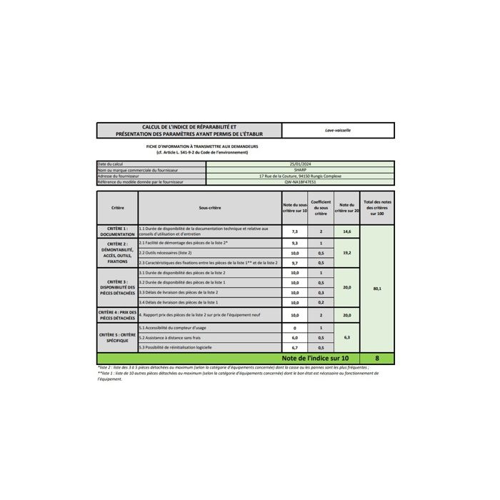 | Indice de réparabilité | 8 |