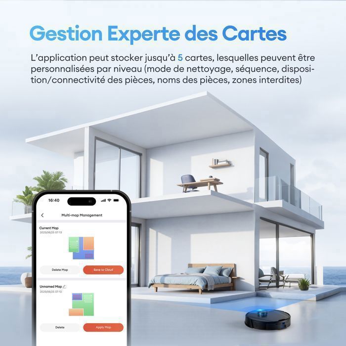 Scannez votre intérieur avec la technologie LiDAR et créez jusqu’à 5 cartes détaillées ! Segmentez les pièces, définissez des zones interdites ou prioritaires et planifiez un nettoyage pièce par pièce pour un intérieur parfaitement propre et sur mesure. 💡🏠