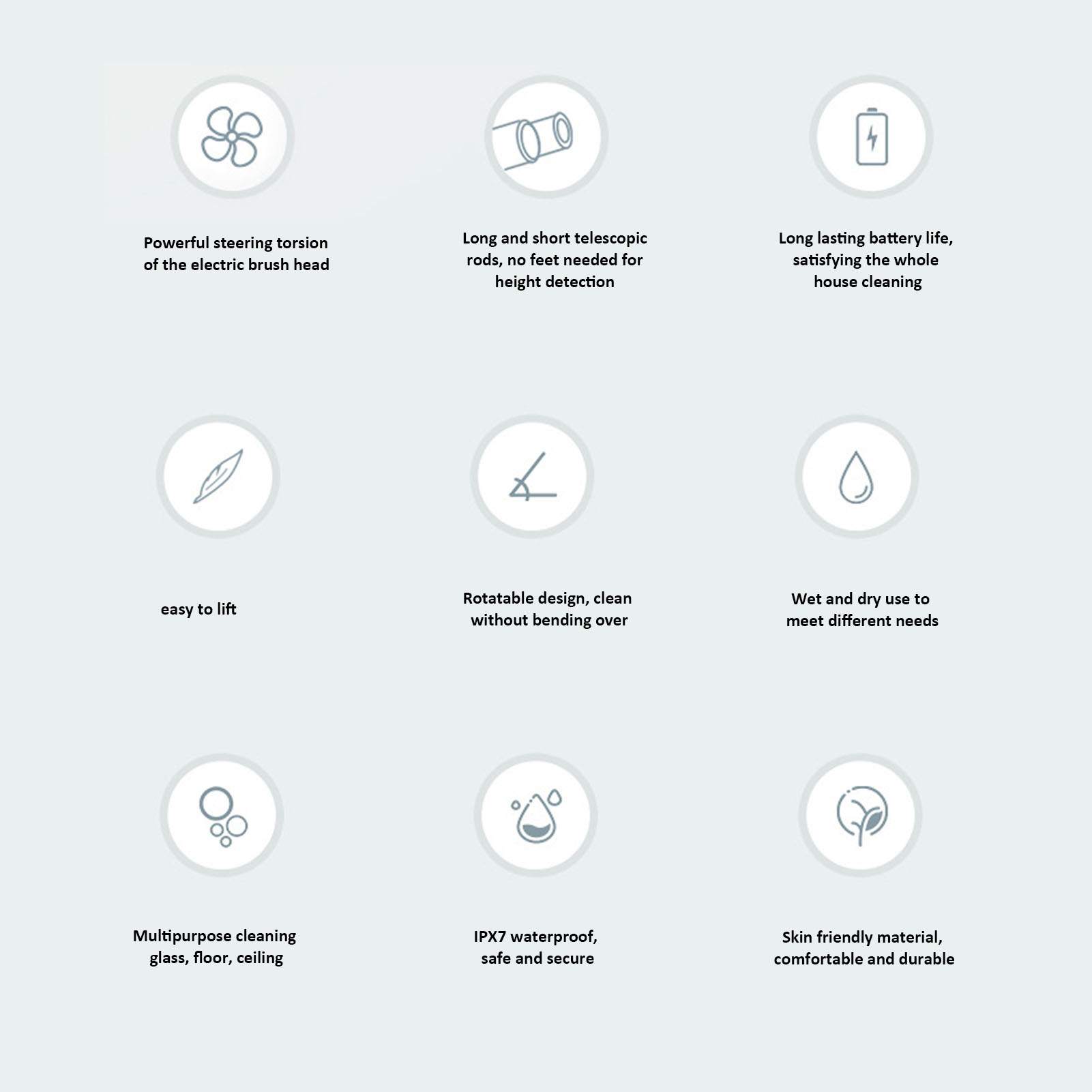 5. Portée de l’application: La brosse de nettoyage électrique convient à différents environnements, tels que le nettoyage des fenêtres, le lavage des voitures, le nettoyage du sol, etc., pour répondre à différents besoins.