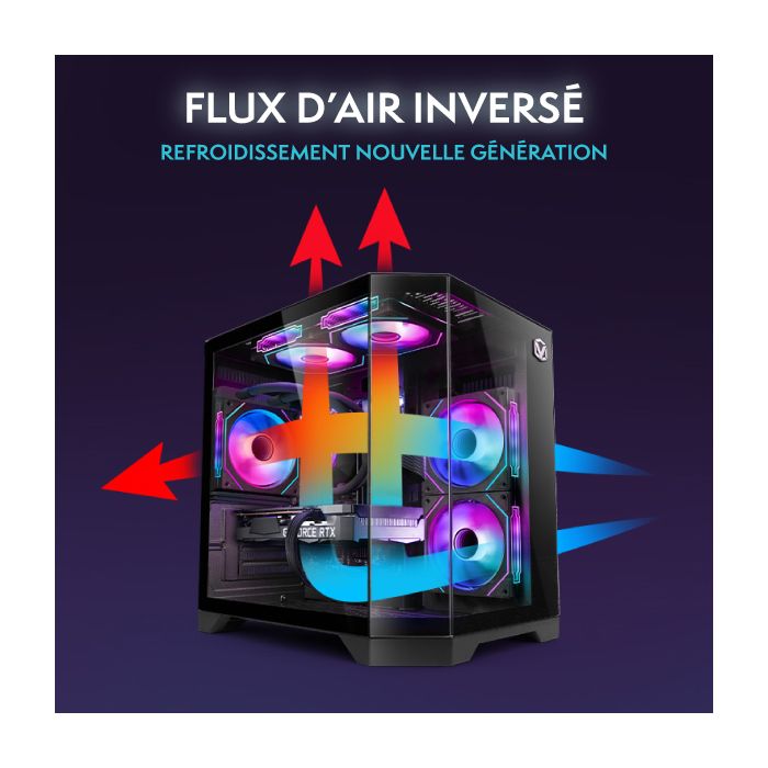 | Caractéristiques | Panneau avant à effet miroir infini | Flux d’air exceptionnel | Conception compacte en verre | Superbe RGB, vue complète des composants |