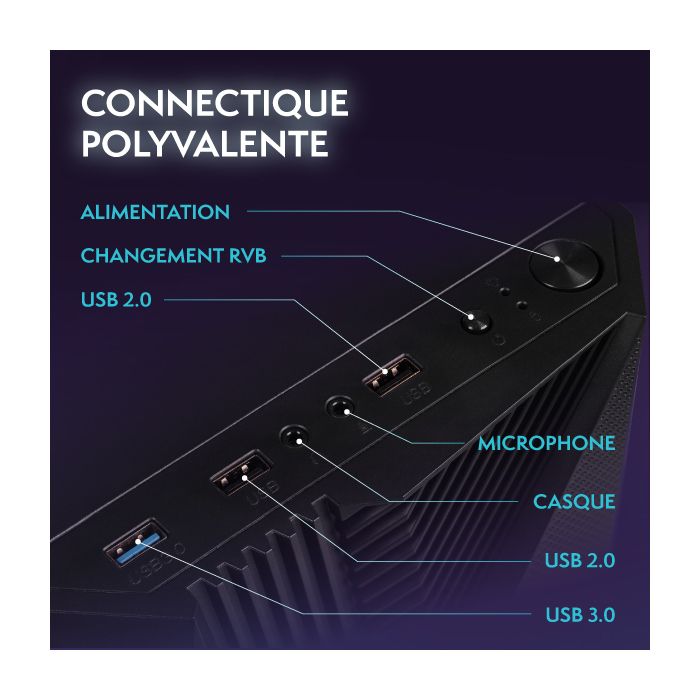 Les ventilateurs haute performance Vibox améliorent le flux d’air tout en ajoutant un superbe effet lumineux miroir infini. Personnalisez votre configuration avec plusieurs modes et couleurs RVB pour une expérience de jeu dynamique et unique.