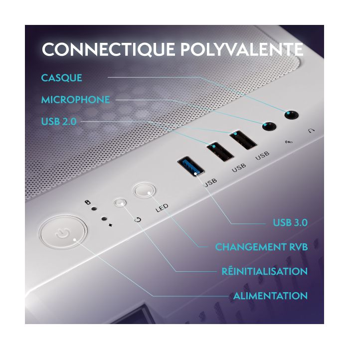 | Caractéristiques | Panneau avant à effet miroir infini | Flux d’air exceptionnel | Conception compacte en verre | Superbe RGB, vue complète des composants |