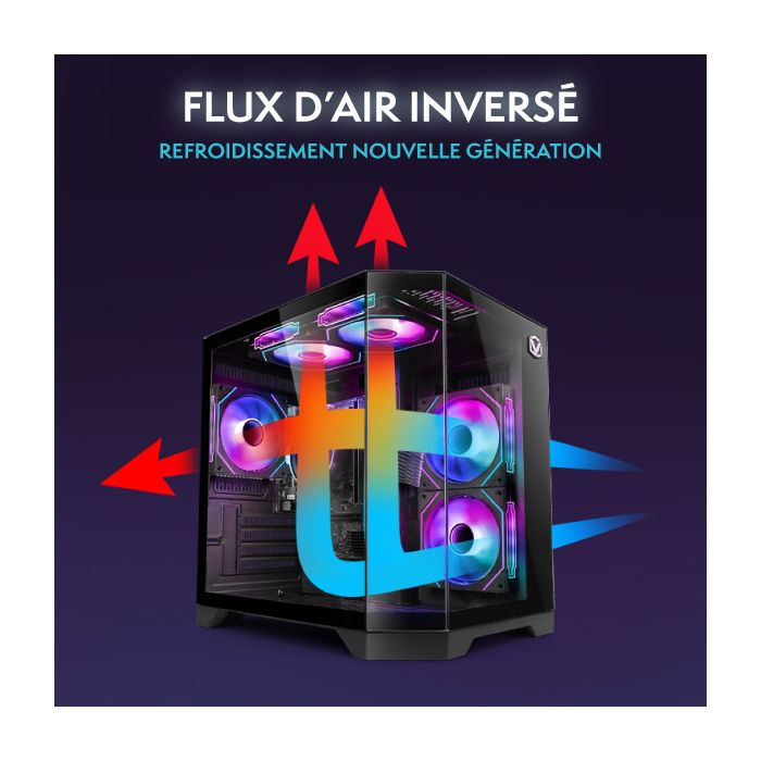 Caractéristiques Conception compacte Panneau avant à effet miroir infini Flux d’air exceptionnel Conception compacte en verre Superbe RGB, vue complète des composants