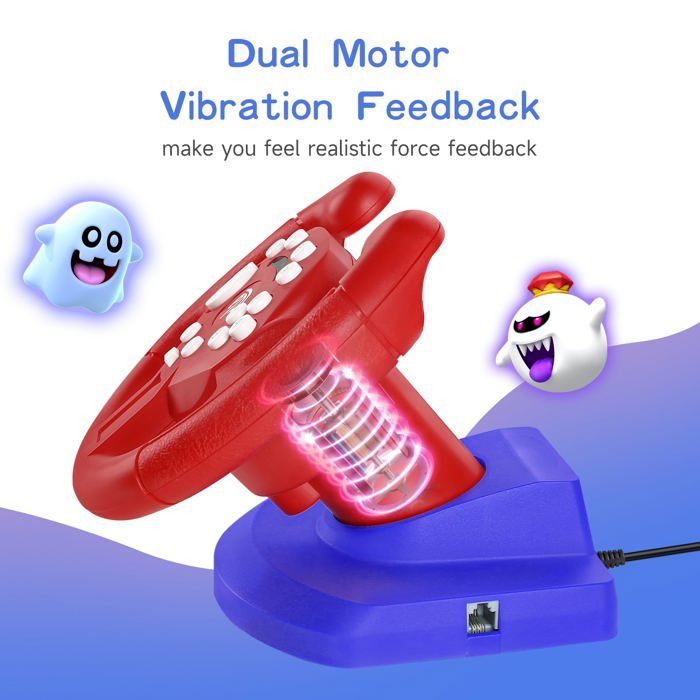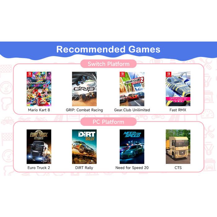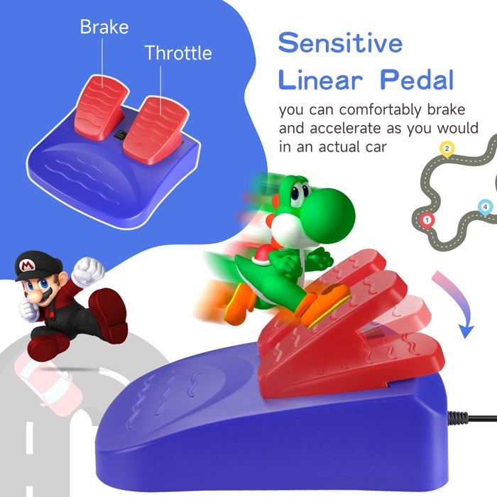 Compatibilité multiplateforme : le volant de course est entièrement compatible avec Nintendo Switch/Switch Lite/Switch OLED, et également compatible avec PC/PS 3/Android, un plug and play, aucun paramètre supplémentaire, vous pouvez facilement démarrer le jeu. ⚠️ : Se connecte uniquement via PC par USB-C.Conçu pour les enfants : Facile à utilise, La taille du volant de jeu spécialement développé pour les enfants est conforme à l’ergonomie des enfants, facile à saisir, et la disposition est simple et facile à comprendre, réalisant le rêve de conduire des enfantsPédale linéaire : Le volant de course Nintendo Switch est associé à une pédale linéaire pour simuler l’accélération et la décélération dans une voiture de course, vous donnant plus de joie dans le jeu de course.Retour de vibration : Le volant de course a un retour de vibration. Lorsqu’il y a une collision dans le jeu, le volant de course vibre, simulant l’expérience de conduite réelle.Fixation par ventouse : Il y a trois très grandes ventouses au bas du volant de jeu, qui peuvent maintenir fermement le bureau, garantissant que le volant ne glissera pas lorsque vous utilisez le volant.