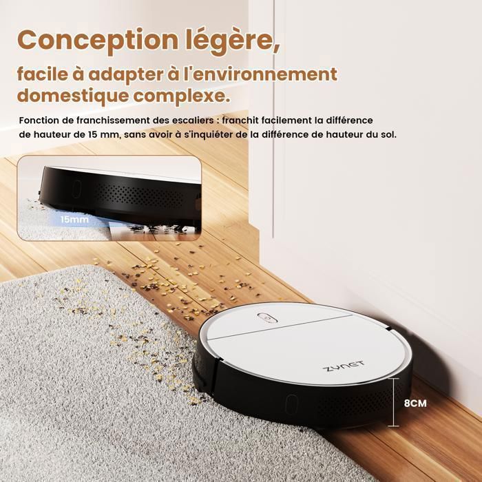 Zynet-D6 Robot aspirateur 3000Pa forte aspiration, ultra-mince, 120Min, recharge automatique, APP/WiFi/Alexa/Siri Control, multi-mode, silencieux, anti-collision/chute, pour sols durs et moquettes